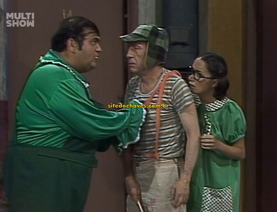 Erro: Enquanto Chaves, Nhonho e Chiquinha conversam no pátio, o professor Girafales observa pela abertura da porta o momento certo de entrar em cena.