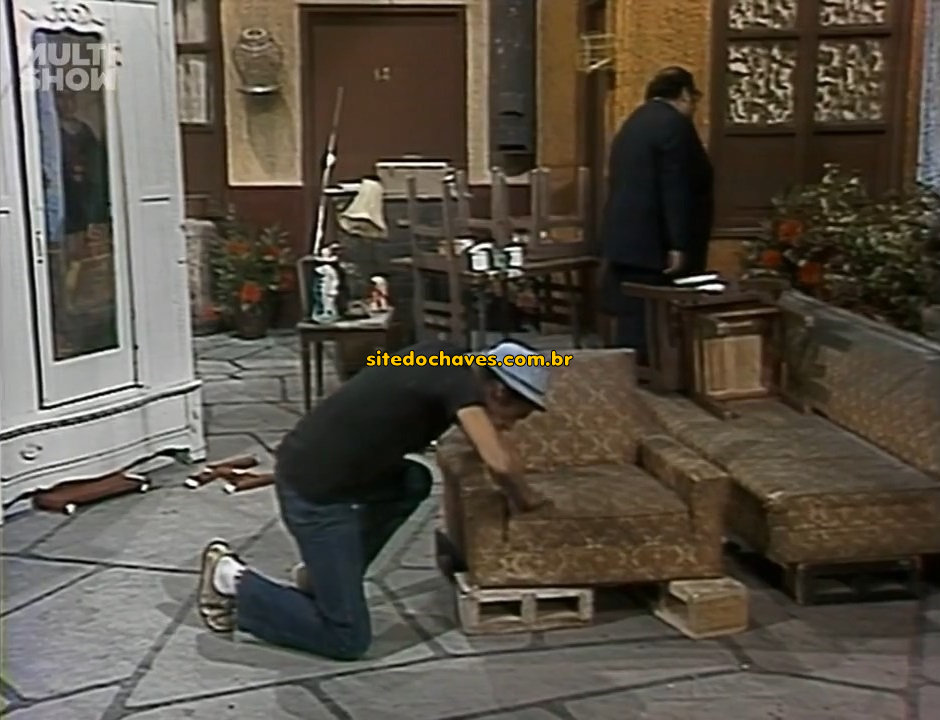 Erro: Chaves está escondido dentro do guarda roupa e a porta acaba se mexendo e mostrando no espelho o Quico escondido atrás do corredor esperando o Senhor Barriga sair para entrar em cena.